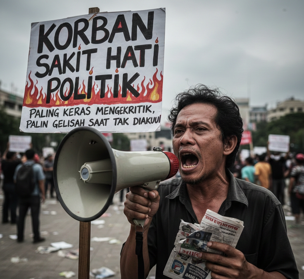 Tropongnews.com– Di tengah riuh rendah demokrasi, muncul satu tipe politikus yang selalu setia hadir di setiap momentum: korban sakit hati politik. Mereka dikenal rajin mengkritik, konsisten menyindir, dan tak pernah absen menyalahkan kekuasaan—terutama ketika kamera tidak lagi mengarah ke wajah mereka.